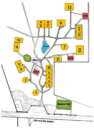 Nr. 12 Familienbungalow mit 2 Betten (160 cm ), Wohnzimmer mit Kabel-TV.Privates Badezimmer, Warm Wasser, Klimaanlage, Kochecke mit Kuehlschrank und Gaskocher. gut fuer 4 Personengut fuer 4 Personen Preis/ price: 2,800 pesos Room No. 12 Family bungalow with 2 queen size beds (160 cm), Living room with Cable-Tv, Private bathroom, Warm water, Kitchenette with Refrigerator and Gas-stove, good for 4 persons Reservation |